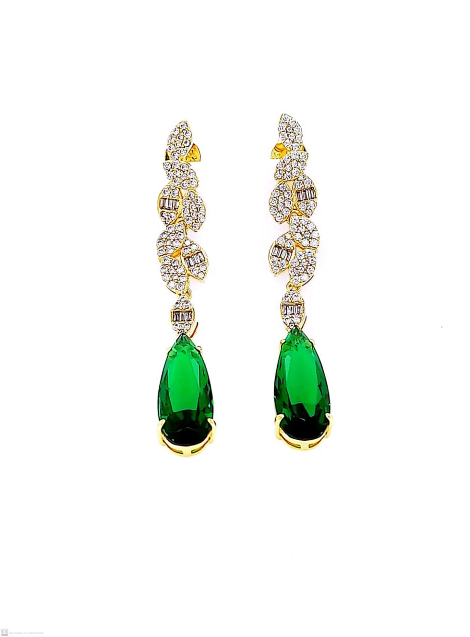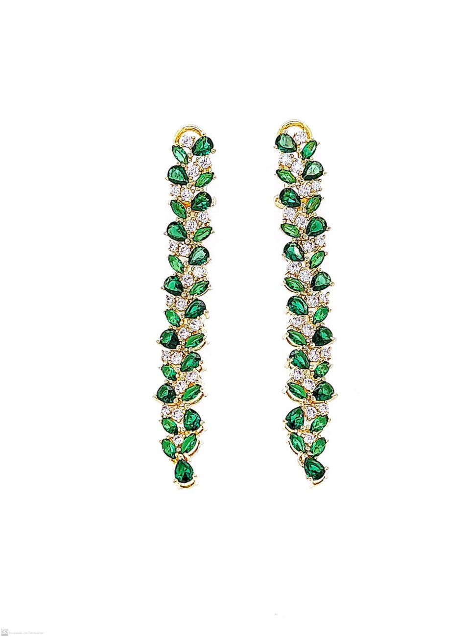 Aretes largos de plata 925 bañados en oro con diseño de hojas con circones transparentes y gota en verde.