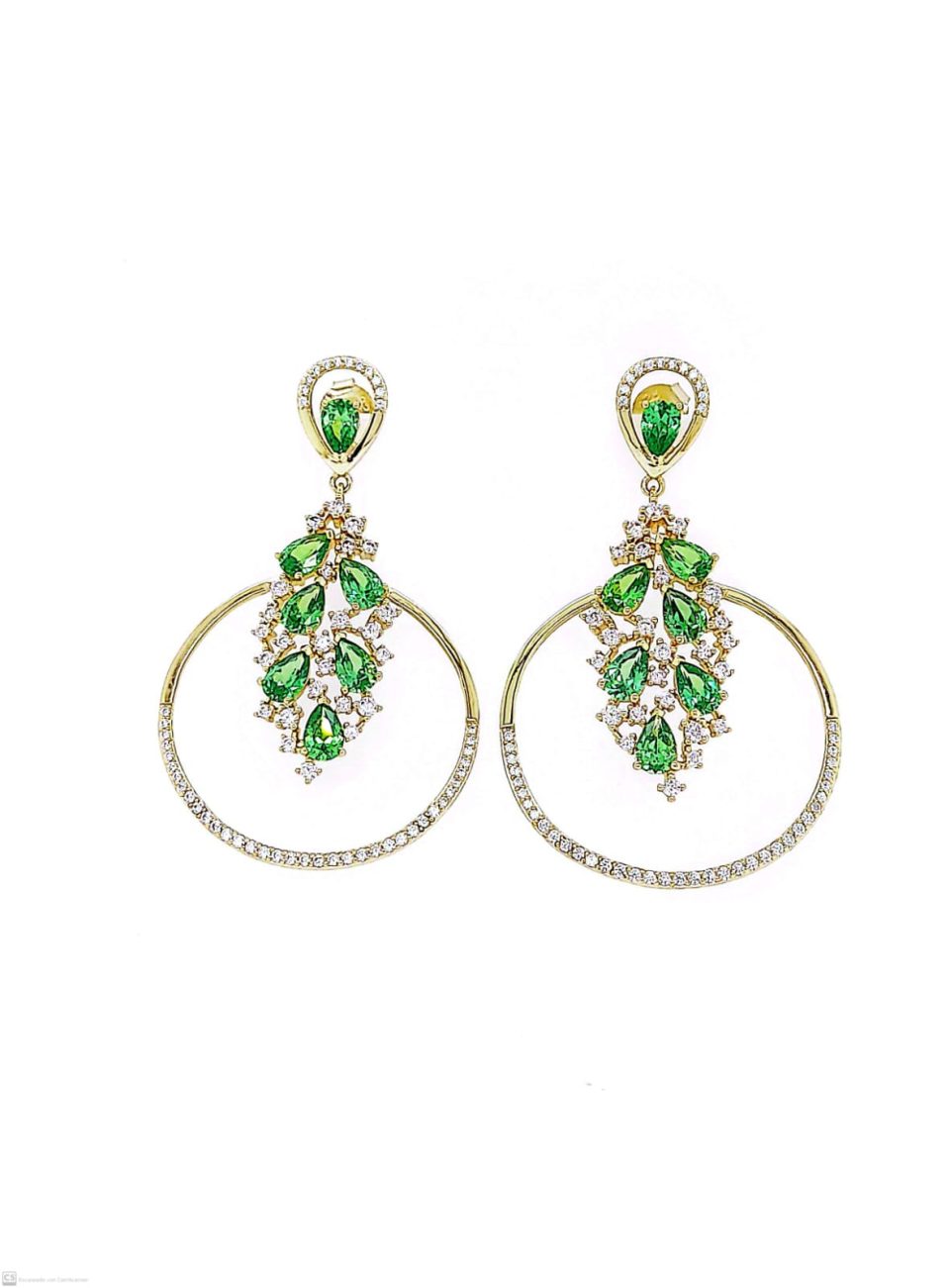 Aretes largos de plata 925 bañados en oro circulo con circones micro pavea y circones verdes en forma de gota.
