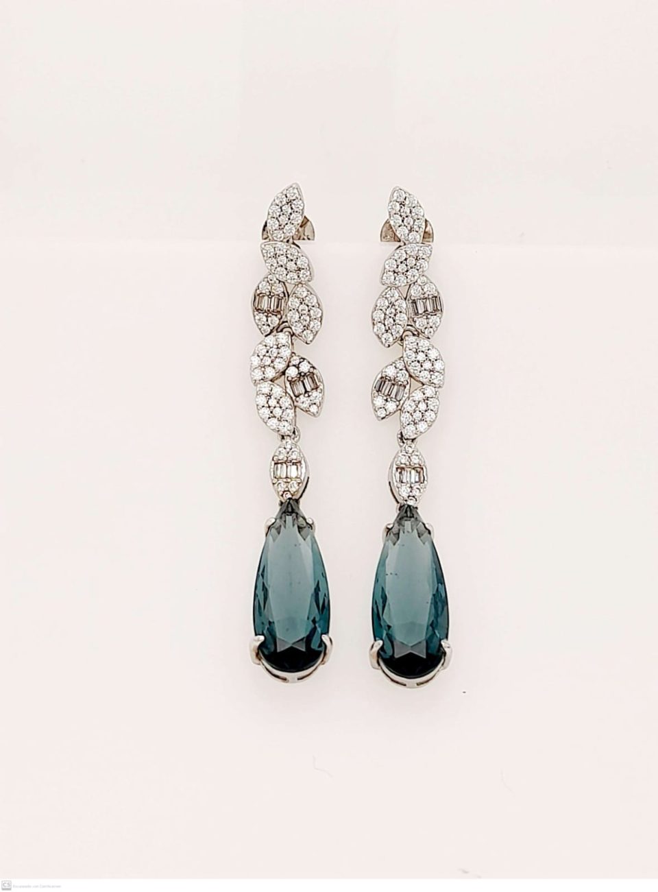 Aretes largos de plata 925 bañada en oro con circones en forma de gotas color verde aqua.