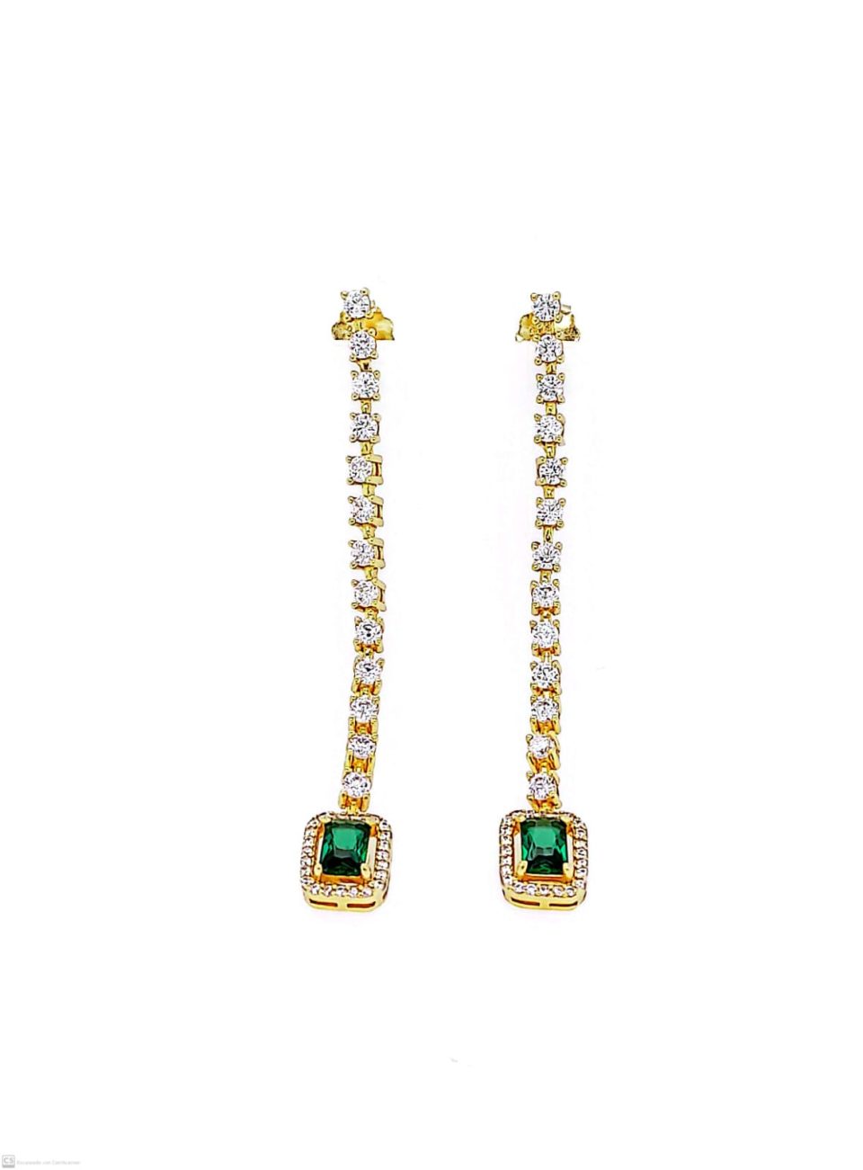 Aretes largos de plata 925 bañados en oro circones transparentes y cuadrado al final en circón verde