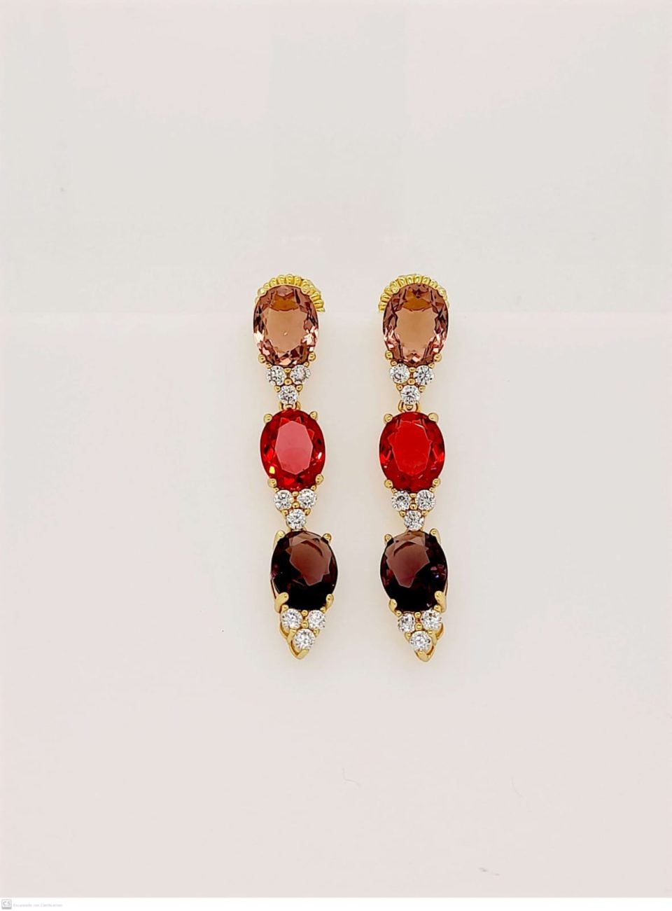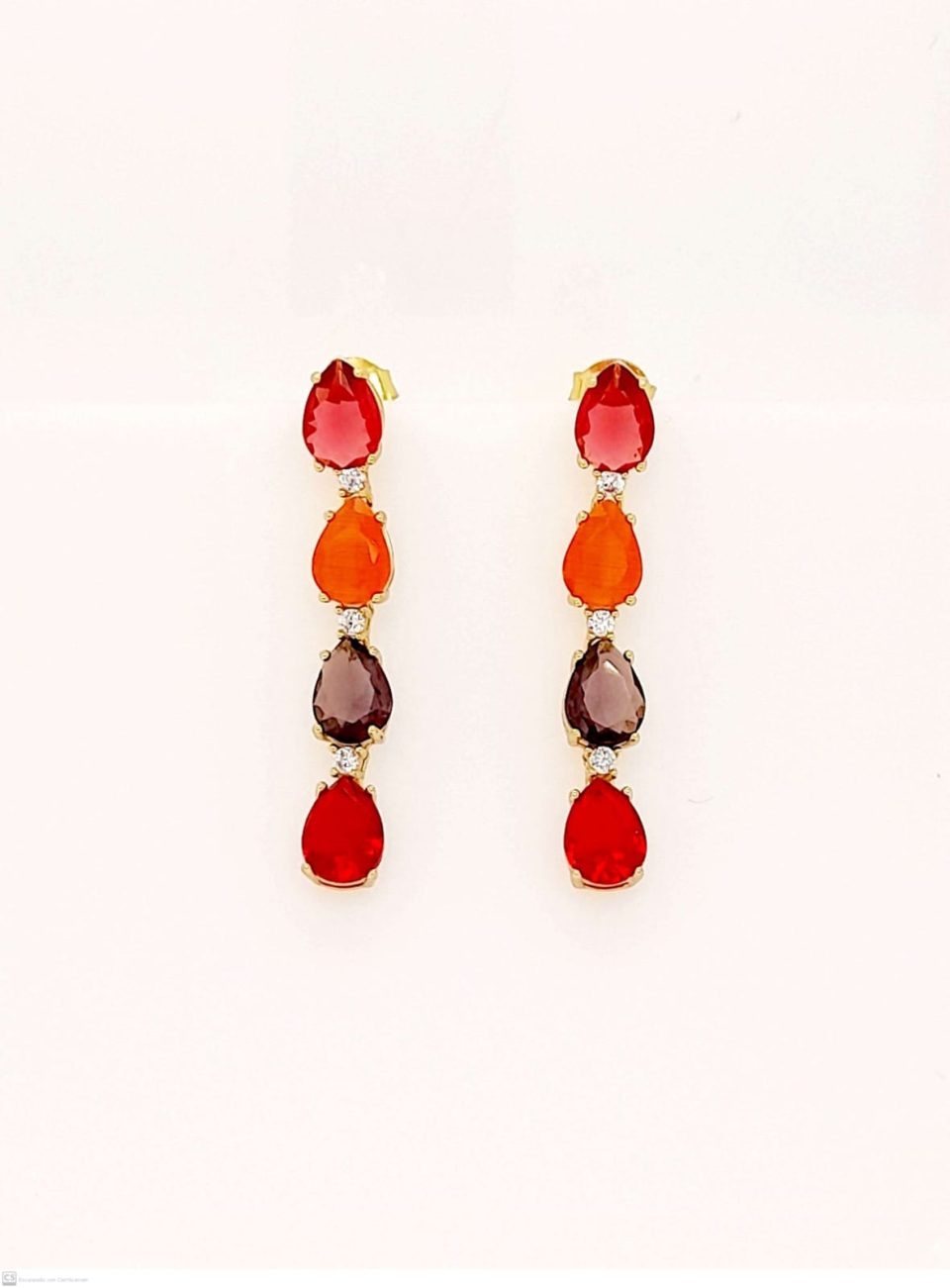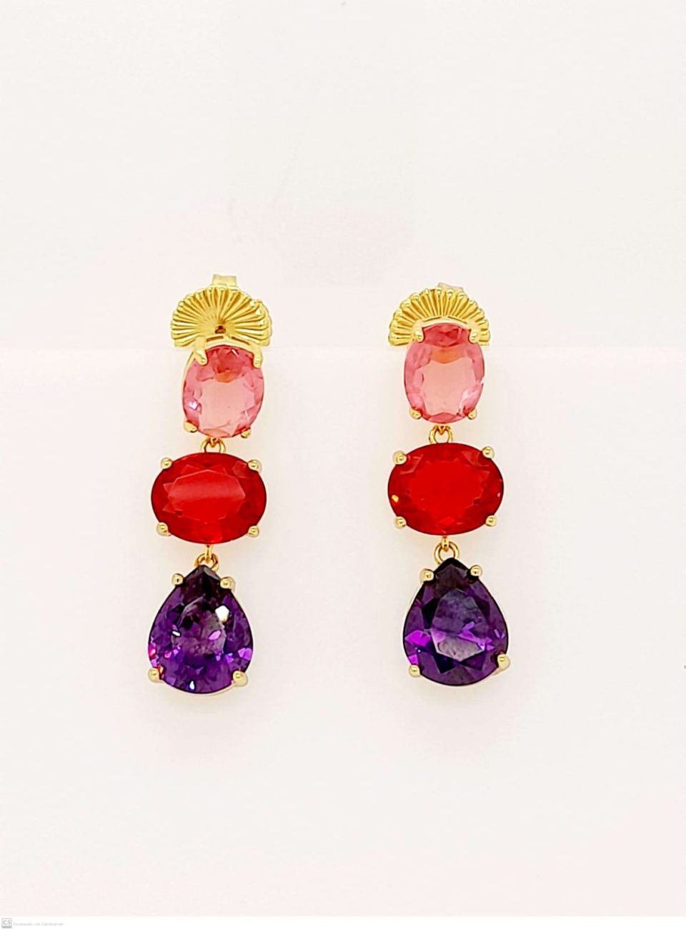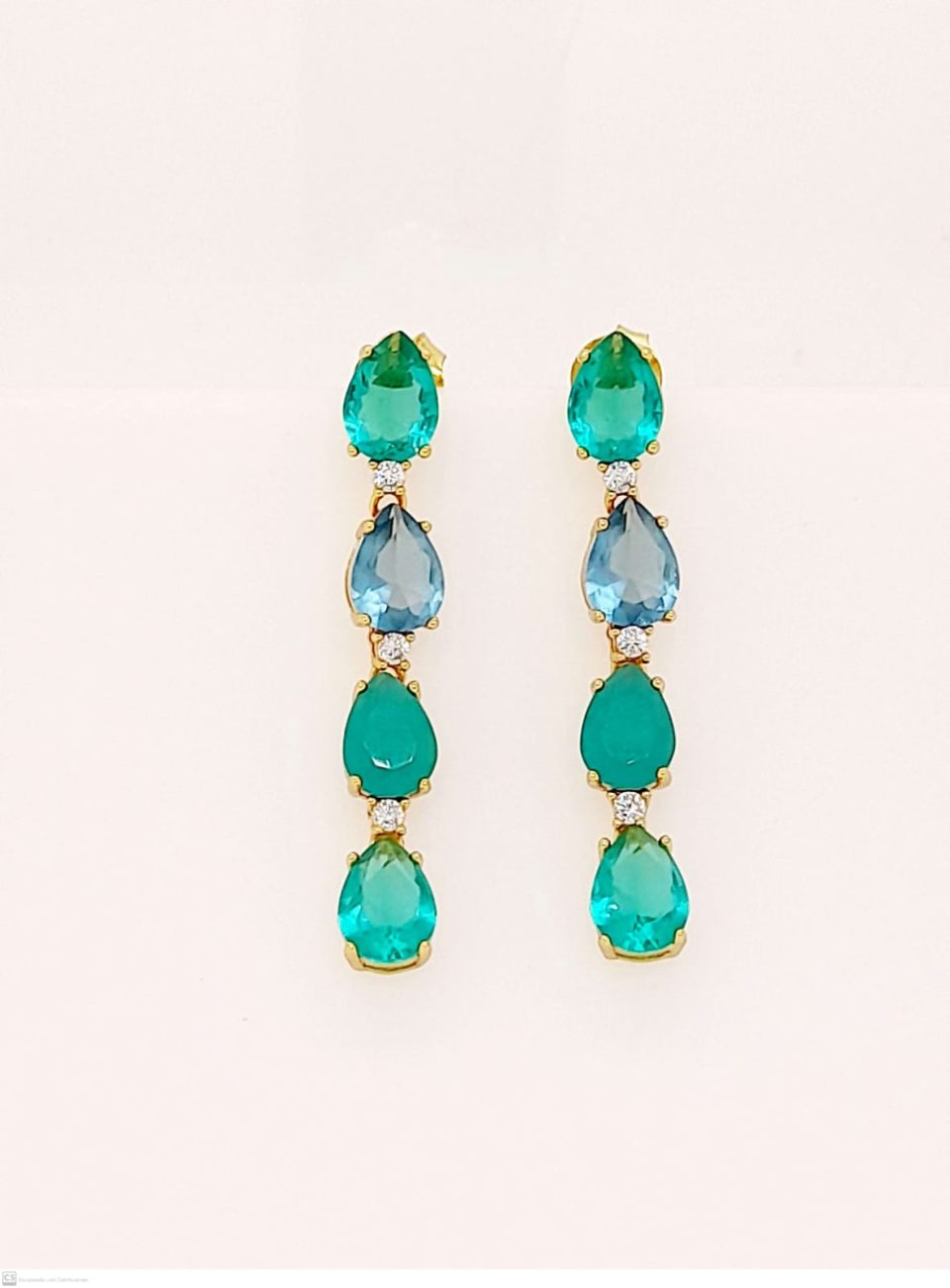 Aretes largos de plata 925 bañados en oro con circones de colores ovalados y de gota.