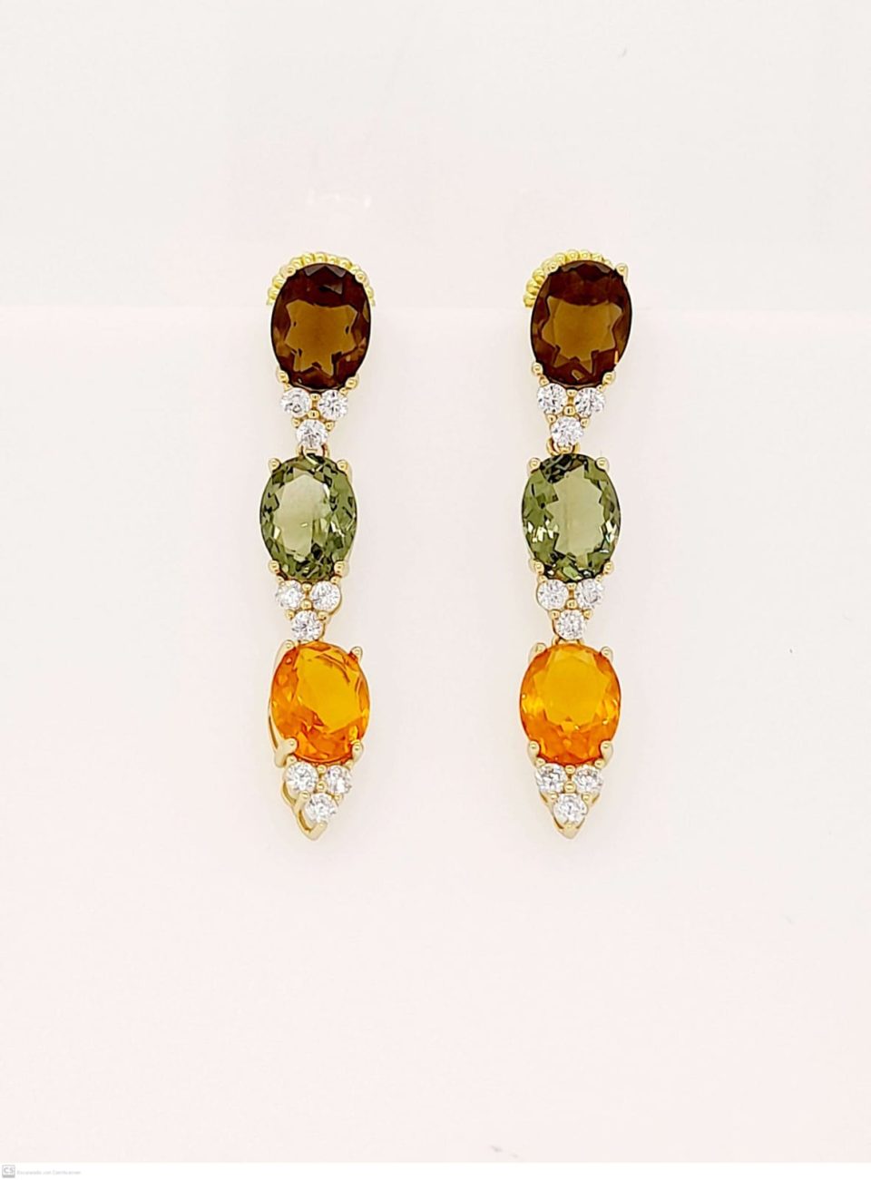 Aretes de plata 925 bañados en oro con circones en marrón, verde oliva y ámbar .