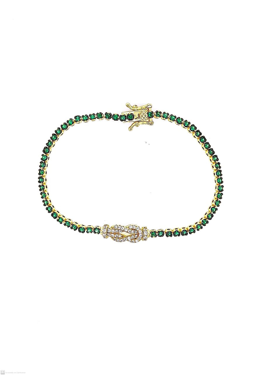 Pulsera tenis de plata 925 bañada en oro con circones verdes y dije entrelazado en el centro.