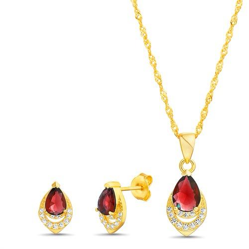 Juego de plata 925 bañado en oro, gota con circón rojo.