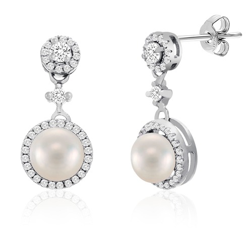 Aretes de plata 925 circón redondo y perla colgante con borde en circones micro pavea.