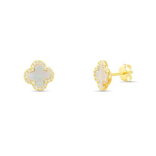 Aretes de plata 925 bañado en oro flor tipo van cleef en nácar con borde en circones transparentes.