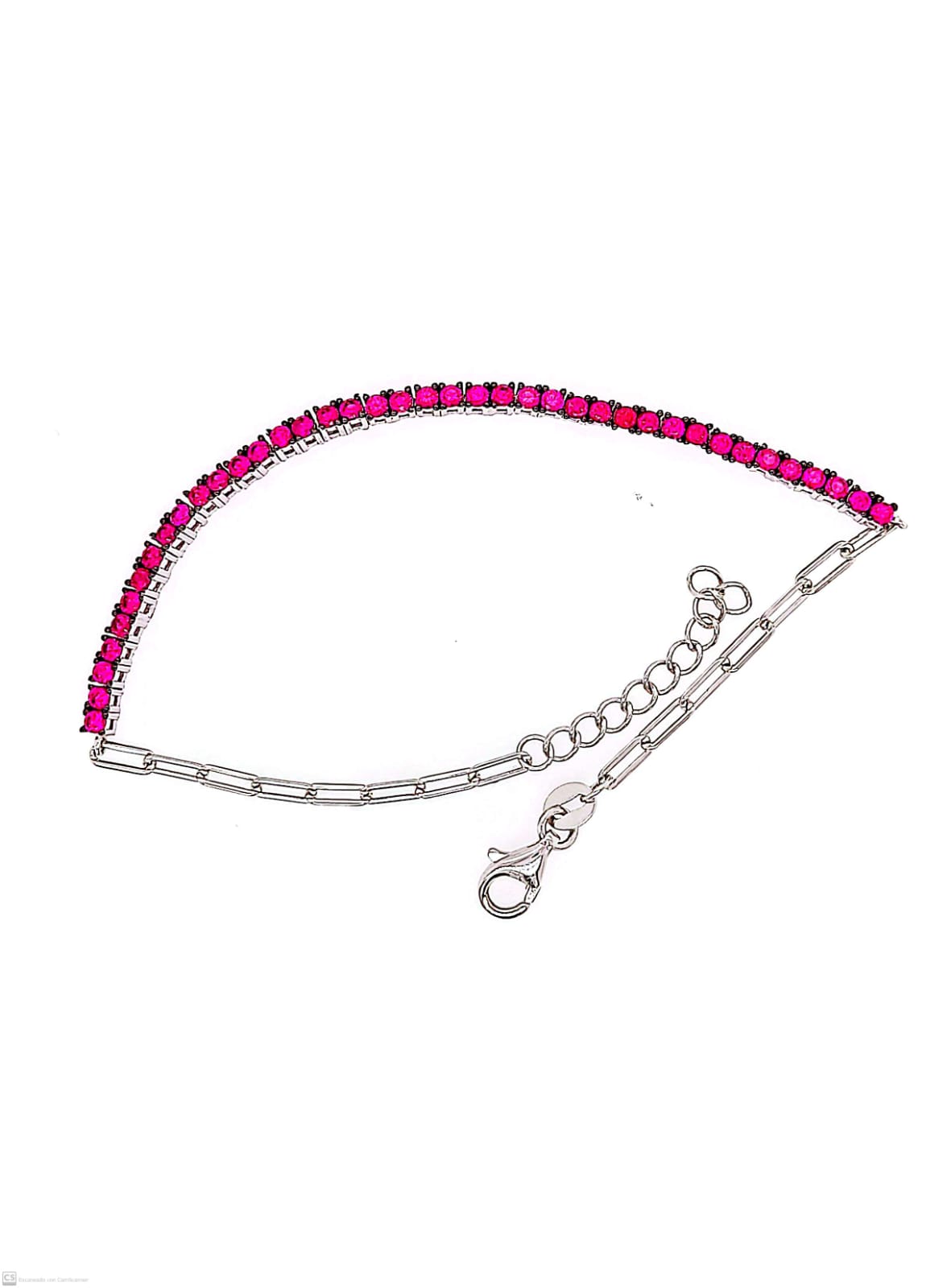 Pulsera de plata 925 con circones fucsia y cadena de eslabones largos en los extremos.