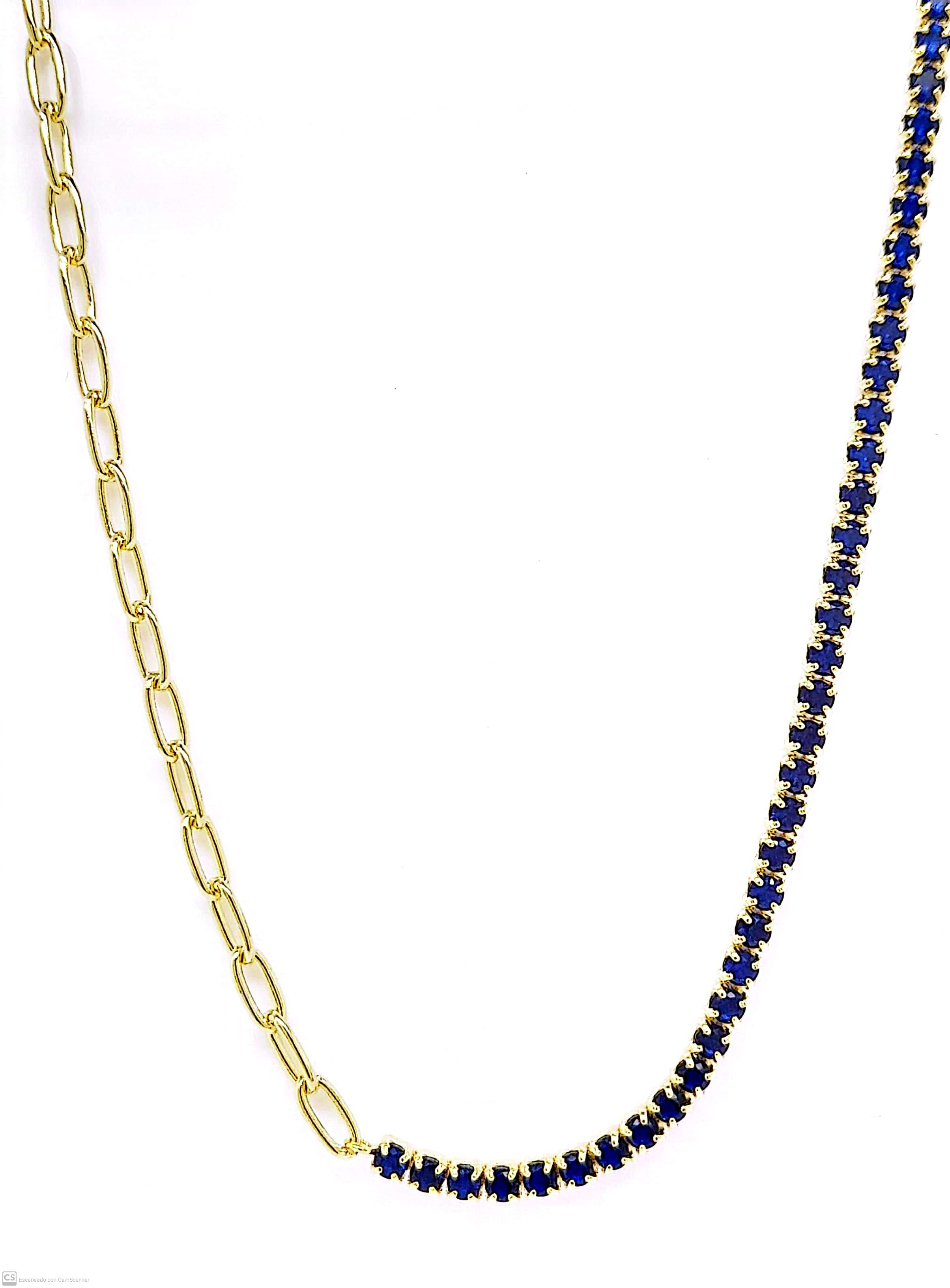 Collar dorado mitad tenis en azules y mitas cadena de eslabones ovalados.