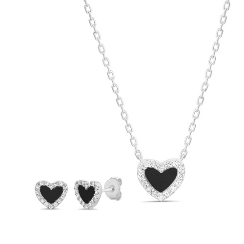 Juego de plata 925 rodinado de corazón ónix y borde de circones micro pavea.
