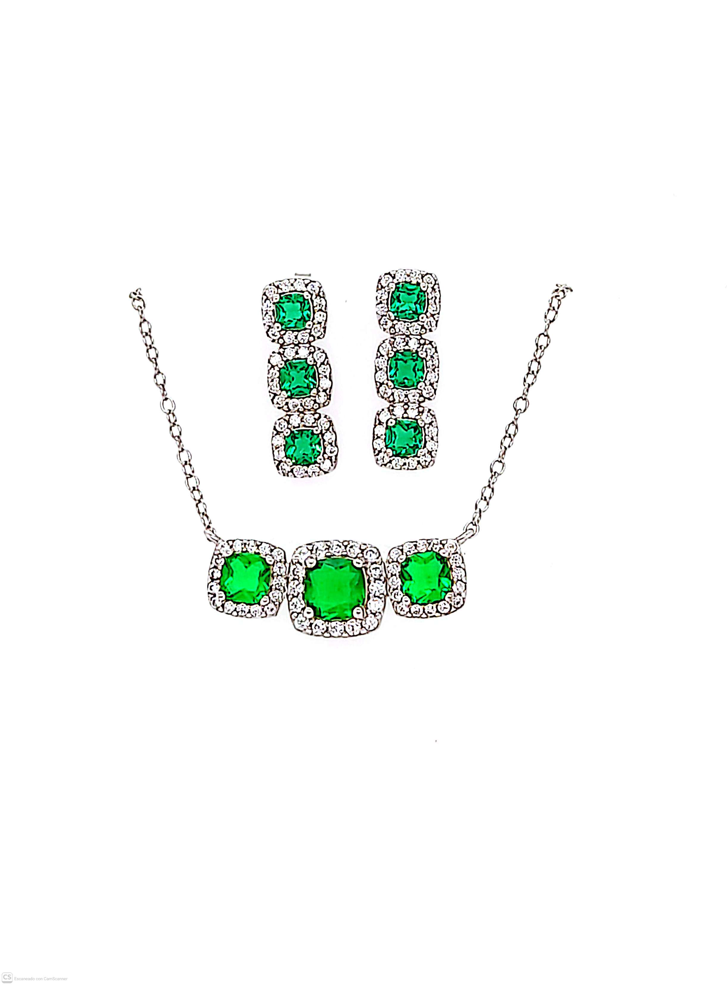 Juego de plata 925 rodinada con barra de tres circones verdes.