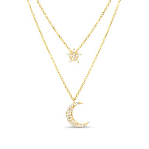 Collar choker de plata 925 bañado en oro cadena doble con luna y estrella.